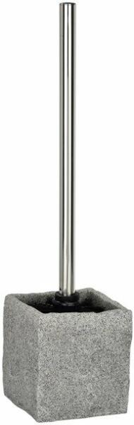 Fürdőszobai készlet, amely egy nyitott tartályból és egy WC-keféből áll. Kőre stilizált műanyagból készült. - méretek: 10 x 10 cm- teljes magasság: 39 cm- fekete, 8,5 cm átmérőjű kefe krómozott fogantyúval- anyag: műanyag- szín: szürke